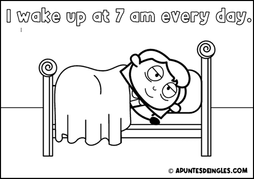 Con este dibujo para colorear de la rutina en inglés 1 se puede repasar el verbo «despertarse» en inglés (wake up) de una forma entretenida y sencilla. En este dibujo se puede colorear el personaje y la oración I wake up at 7 am every day. Además, también se puede dibujar libremente (por ejemplo, decorando la habitación con distintos elementos).